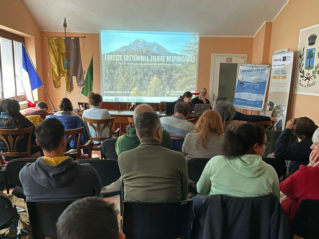 Il secondo incontro, svoltosi solo pochi giorni fa, il 24 novembre a Pomaretto, ha rappresentato un momento particolarmente dinamico e partecipato: una ventina di persone hanno preso parte ai lavori, con la presenza attiva anche dei partner francesi collegati online. L’incontro, dedicato al tema “Foreste sostenibili, filiere responsabili”, è stato caratterizzato da interventi ricchi di spunti e da numerose domande da parte dei partecipanti, segno di un forte interesse verso le opportunità offerte dalla gestione sostenibile delle risorse forestali.